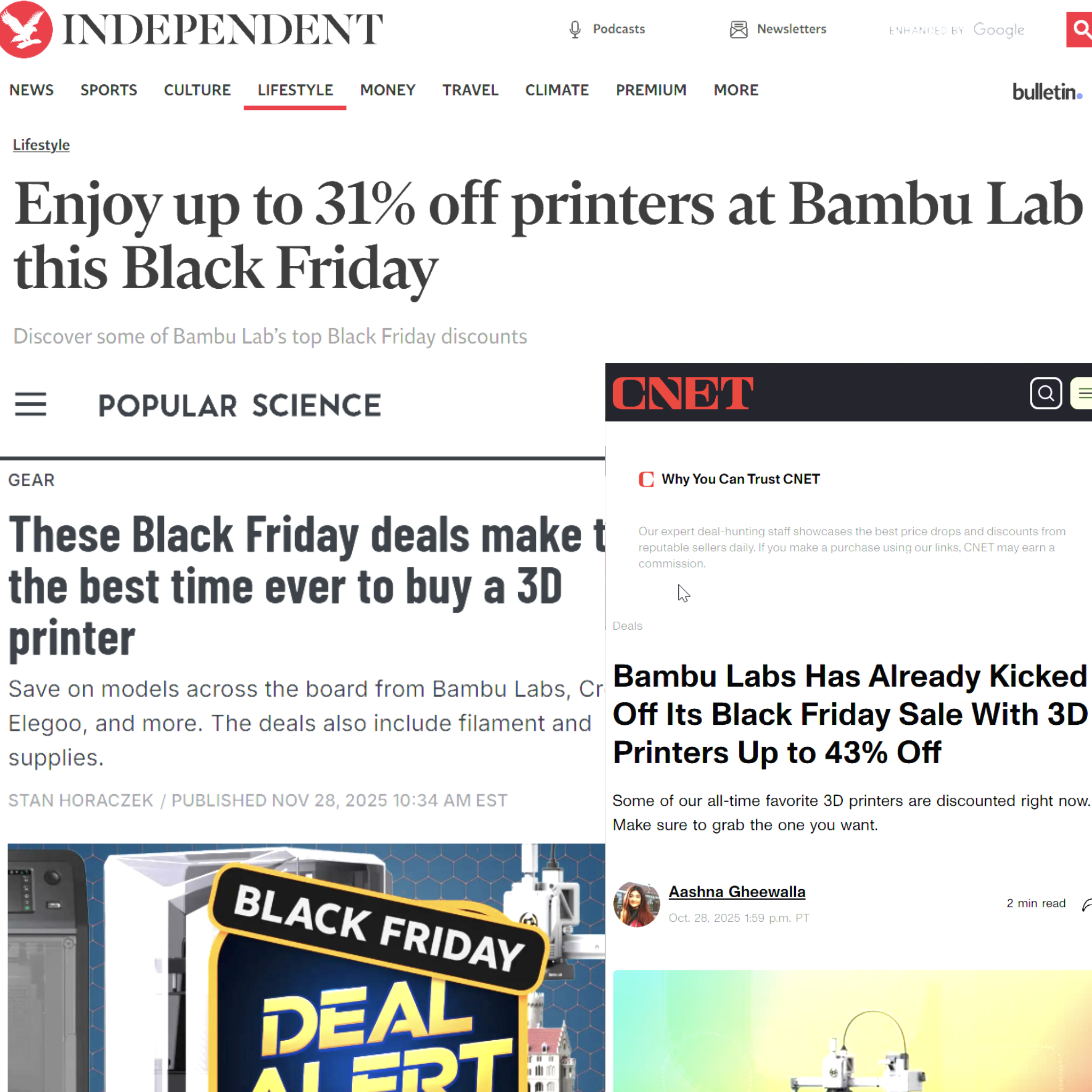 Through a focused media outreach effort spanning the US, UK, and Europe, we secured meaningful coverage across mainstream, technology, creativity, and niche 3D printing publications. The campaign delivered widespread coverage, including 29 Tier 1 placements with features in outlets such as CNET, Tom’s Guide, Tom’s Hardware, TechRadar, CHIP, and GIGA, keeping Bambu Lab consistently visible (and driving sales) throughout the BF-CM period.